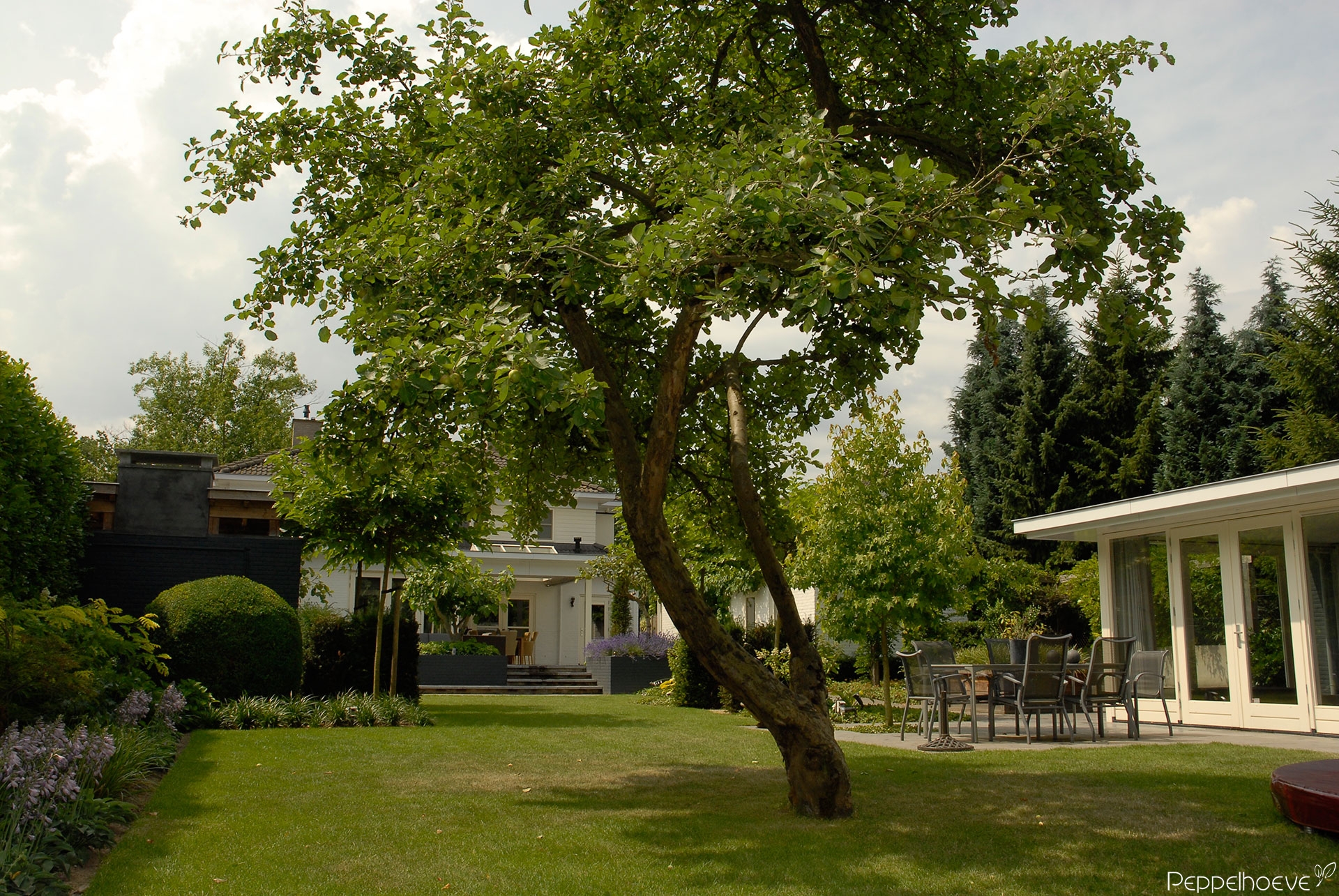 - Overzicht vanuit achtertuin met aan de rechterzijde tweede terras me bijgebouw, oude Peren boom op de voorgrond.
