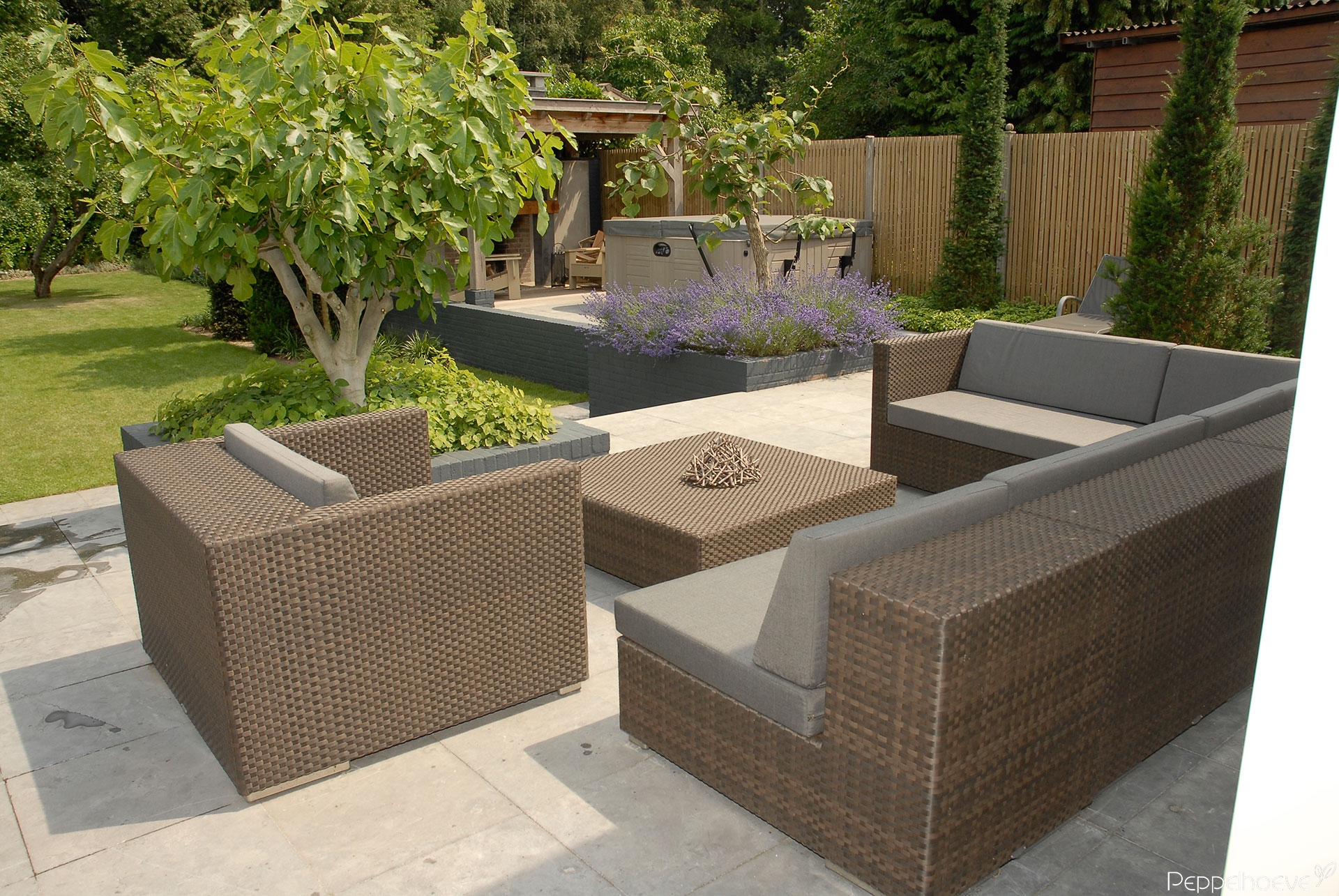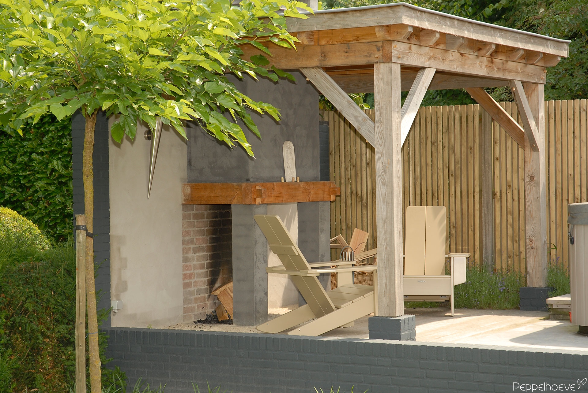 - Vanaf terras aan huis met loungemeubels zicht op spa met kleine overkapping met buitenhaard.