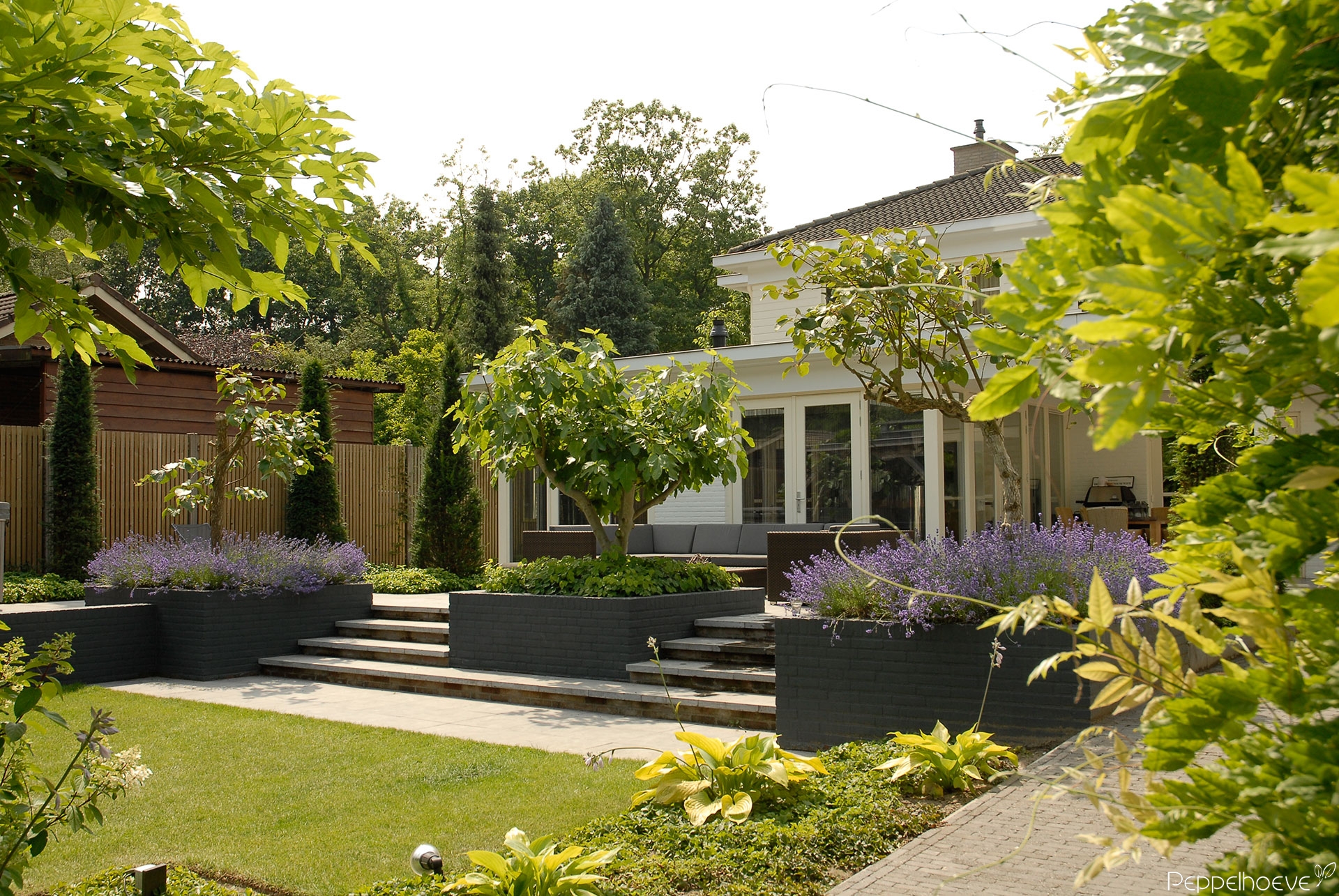 - Trappenpartij naar het hoofdterras aan huis, bakken gemetseld en antraciet gekleurd. Beplant met Kiwi, Vijgen en Lavendel.