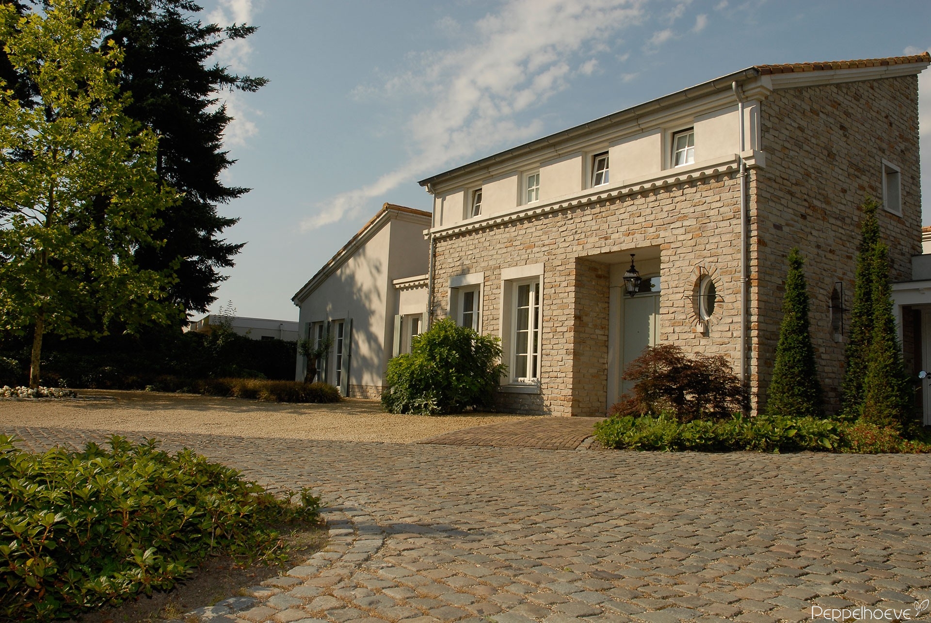 - Voortuin, oprit van kinderkoppen, pad naar de entree van gebakken klinkers en dolomiet als half verharding.