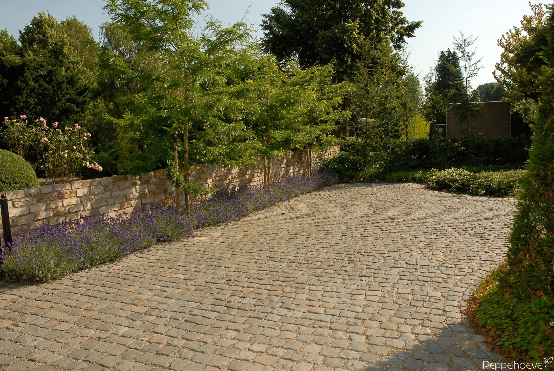 - Voortuin met enkele parkeerplaatsen, muur van natuursteen als afscheiding, drie Christusdoorns als blikvanger in combinatie met Lavendel.