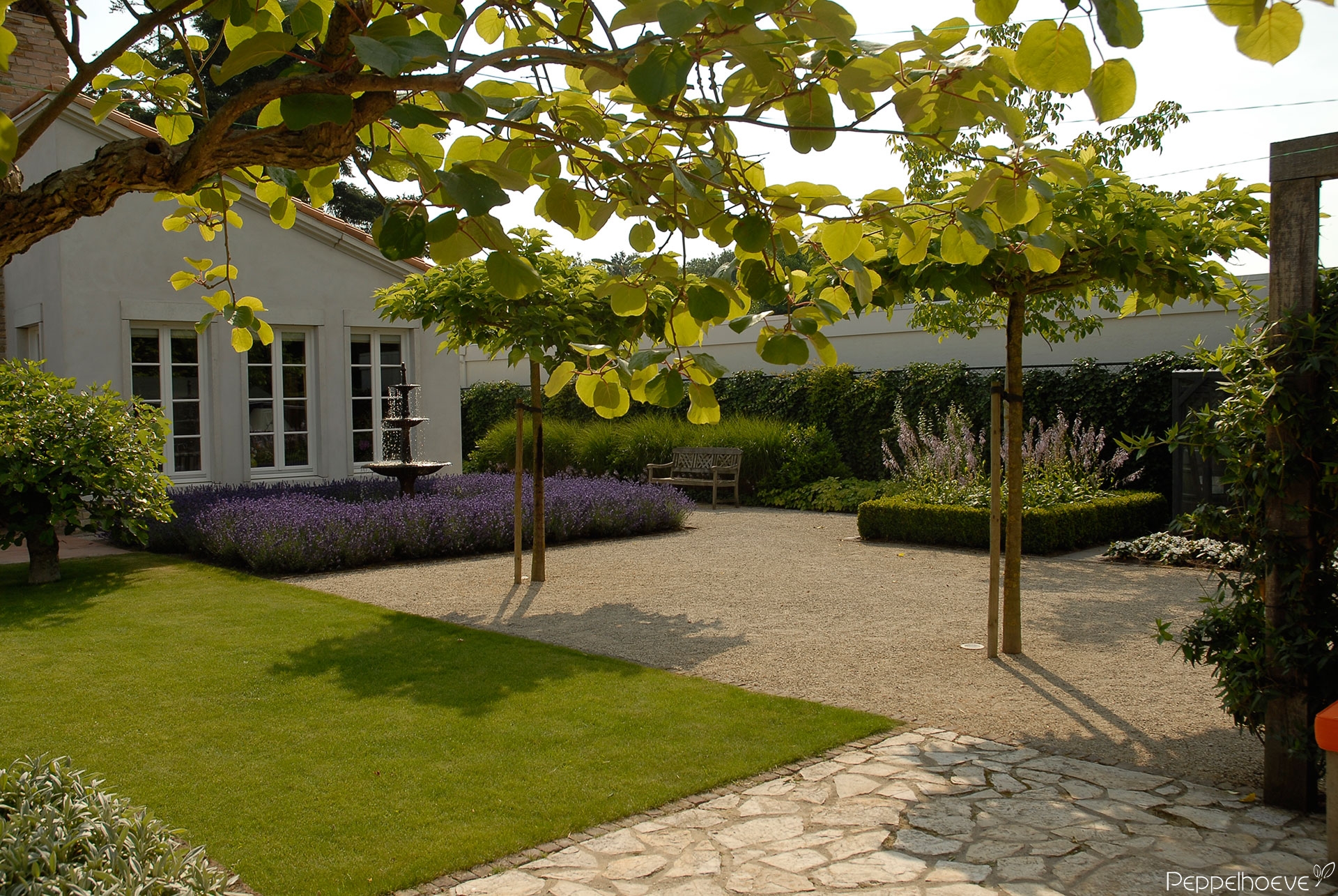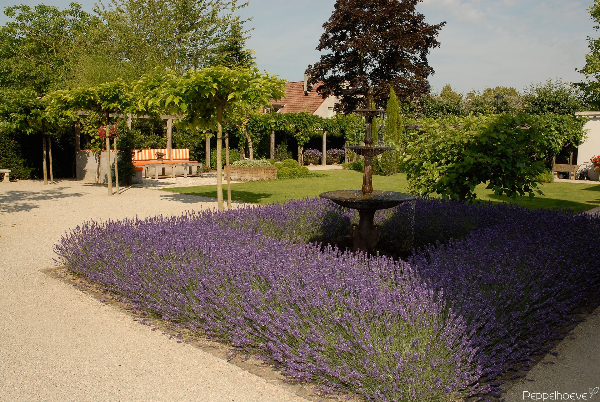 - Gietijzeren fontein met Lavendel omsloten, in de achtertuin loungebanken met extra zit terras en Kiwiboom in tufstenen bak.