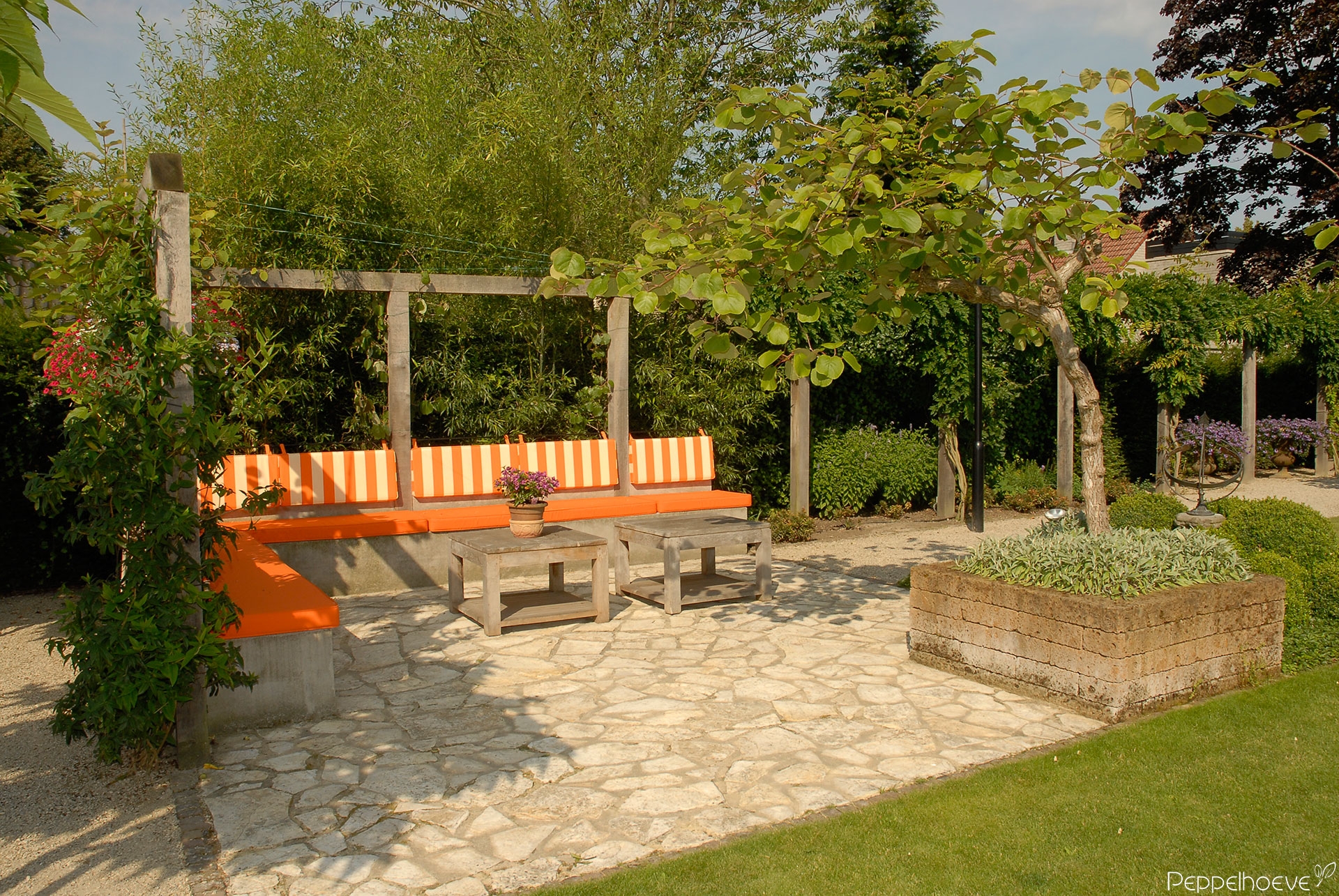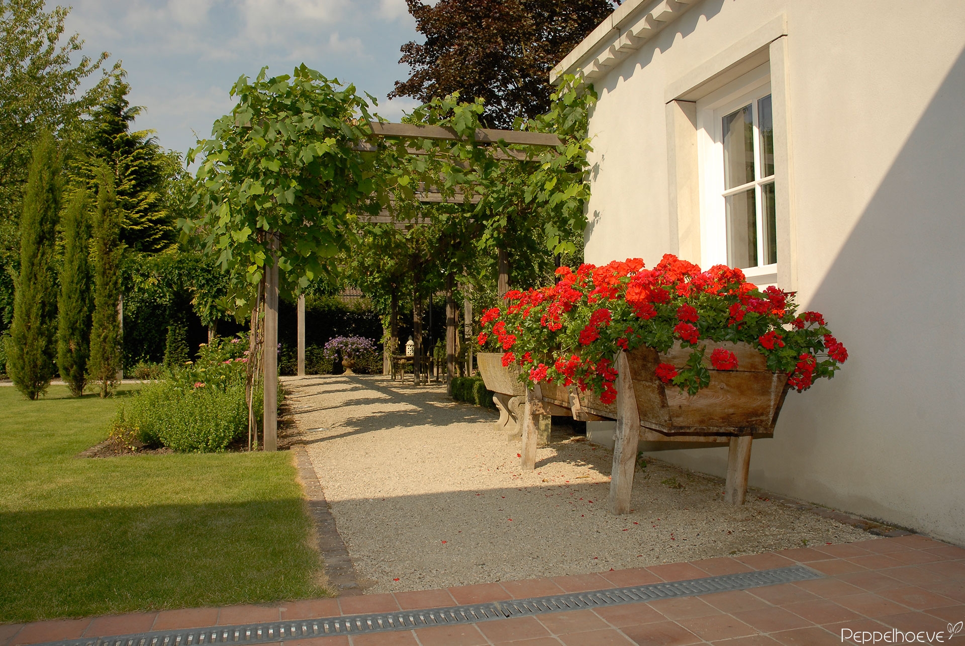 - Oude eikenhouten trog met Geraniums, dolomiet als half verharding en loofgang van hardhout met Druivenplanten.