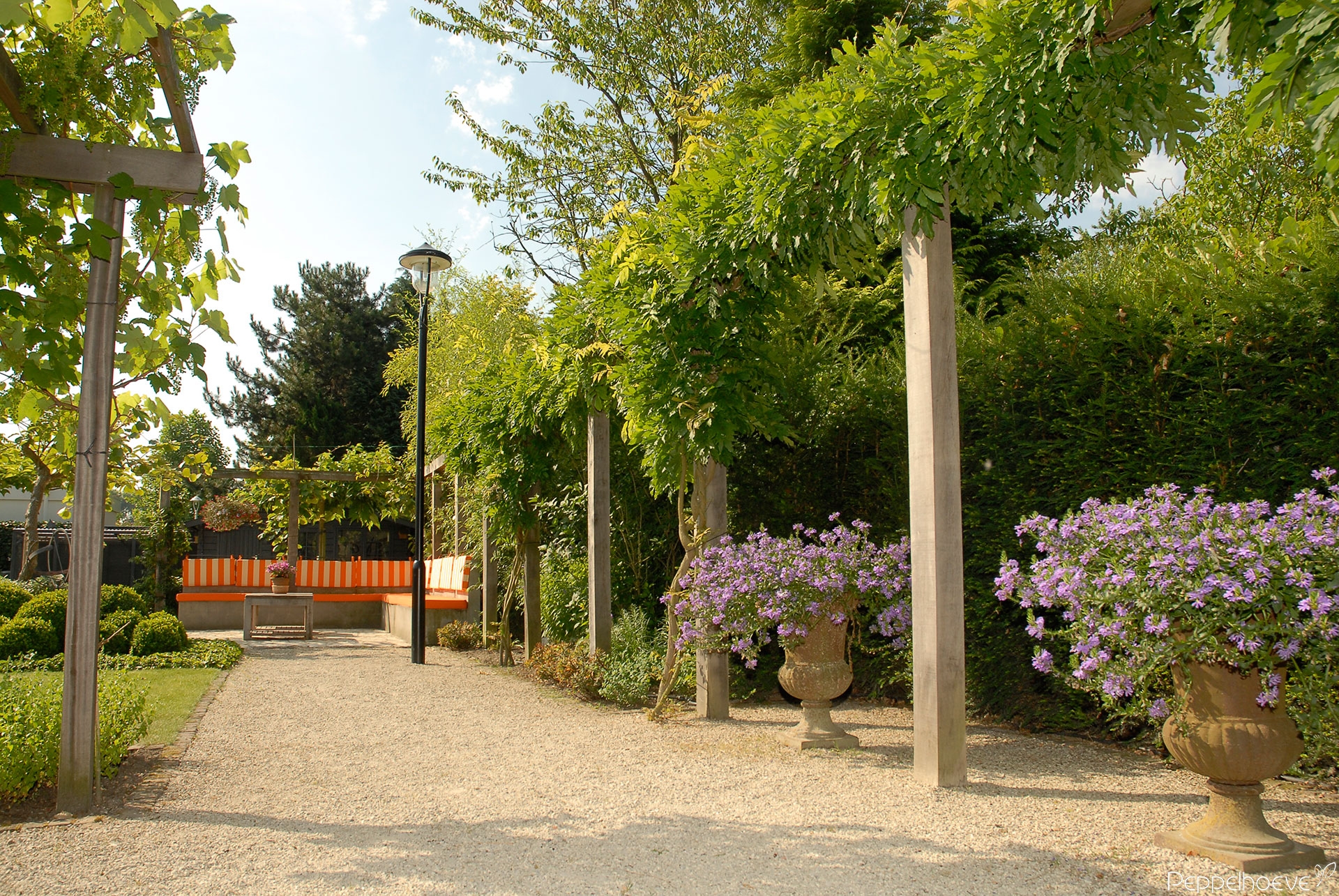 - Looppad van dolomiet, Eikenhouten pergola met Blauwe Regen en gietijzeren vazen met zomer bloeiers.