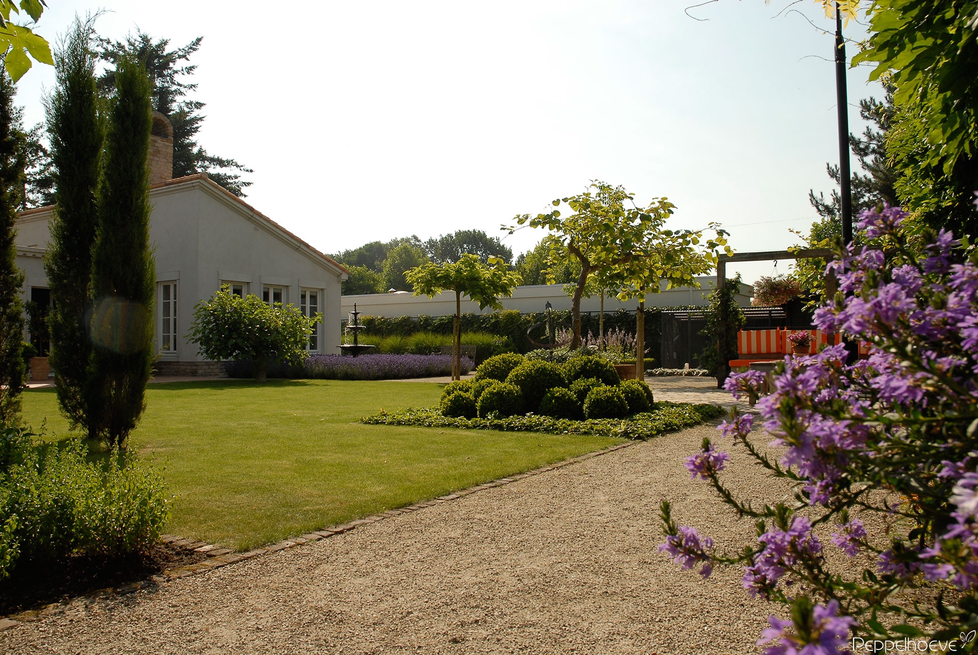 - Overzicht, Cipressen in het gazon, Buxus landschap met Kiwi boom.