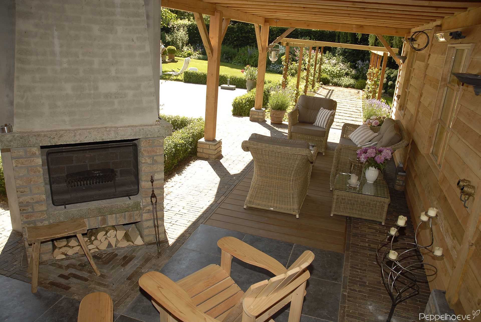 3. In het bijgebouw open haard gemetseld met handvorm stenen en de schouw met specie bezet, vlonder hardhout.