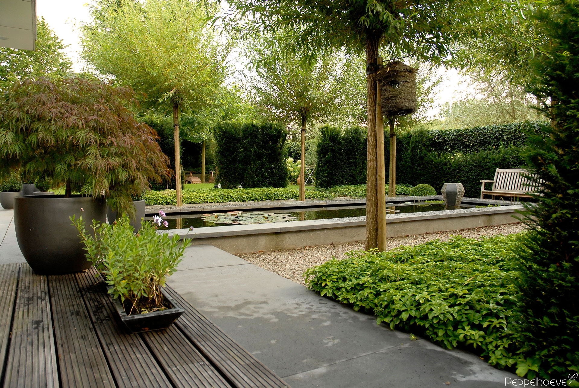 - Vanaf terras aan huis zicht op strakke vijver met knotwilgen, border met Pachysandra bodembedekker en hoge Taxus hagen.