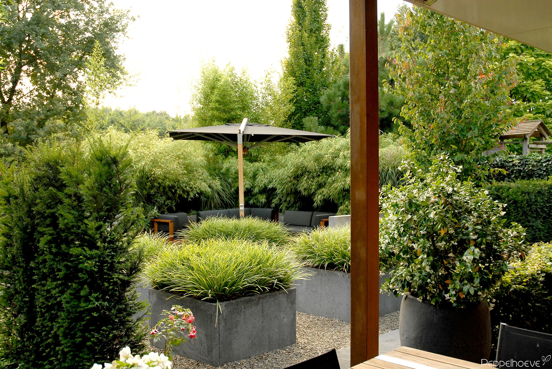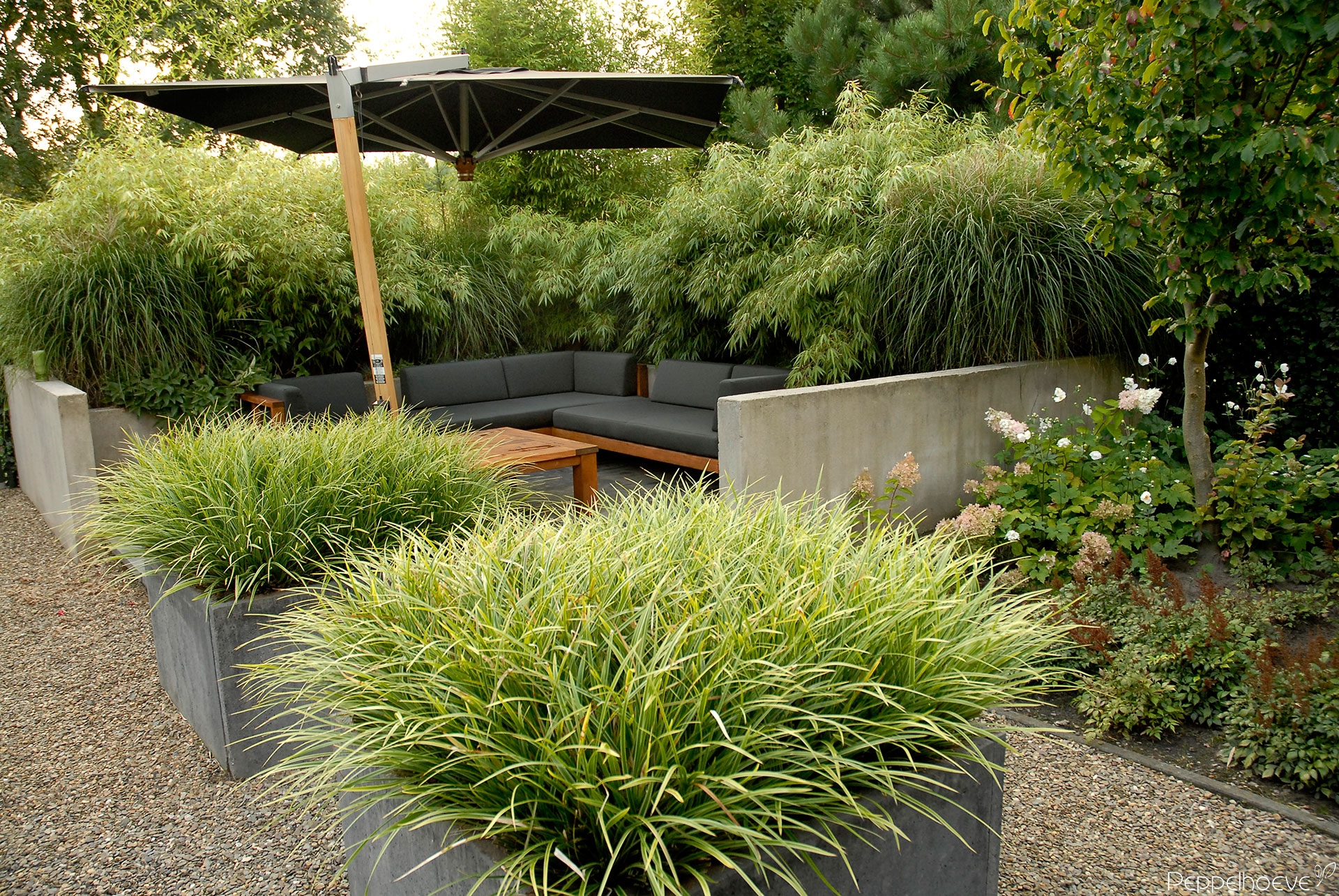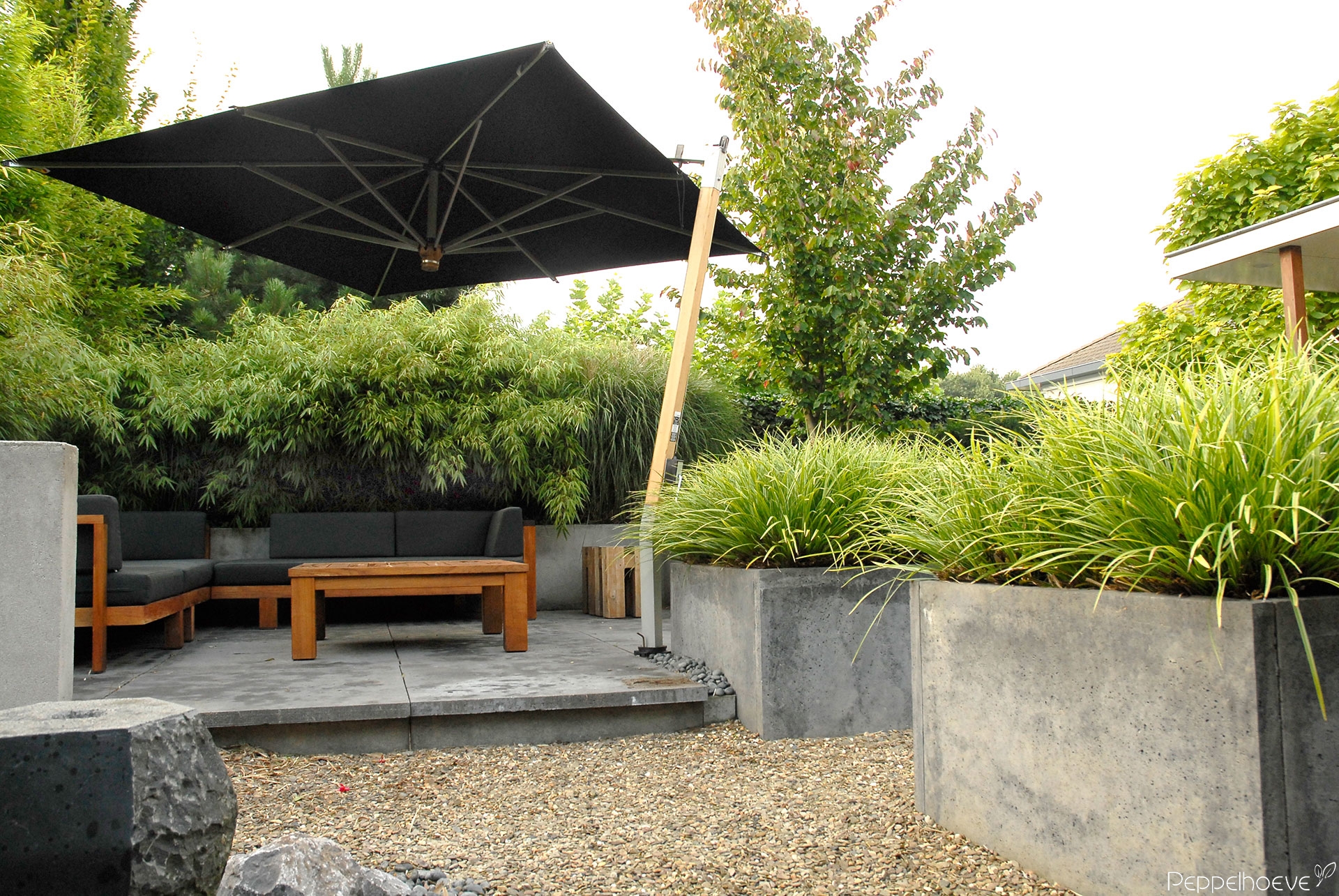 - Doorkijk vanaf terras aan huis met op de voorgrond bakken van betontegels, van 100 x 100 cm, opgeplant met Carex en op achtergrond lounge terras.