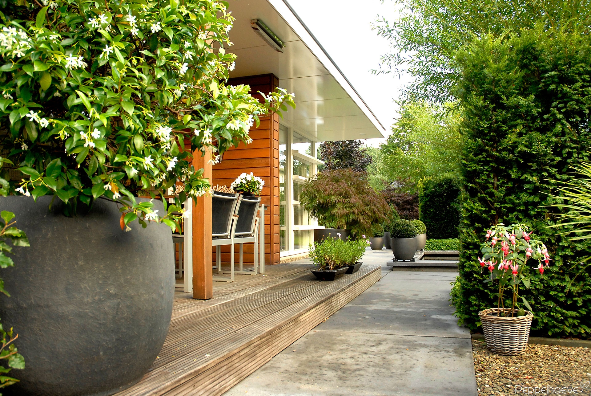 - Zijaanzicht met verhoogt lounge terras. Op de voorgrond bakken met Carex en waterspel, terrastegels van 100 x 100 cm Schellevis.